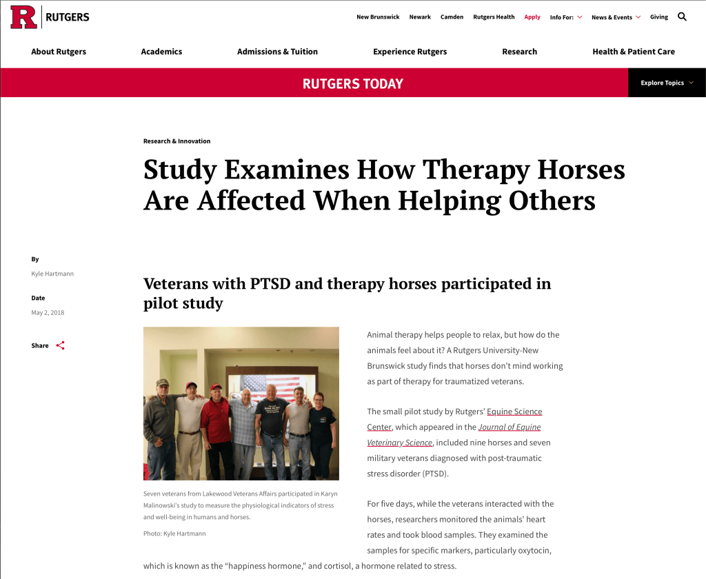 Press release on research study looking into the effect of Equine Assisted Services on Veterans with PTSD. Photography and press release by Hartmann.